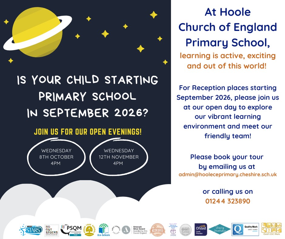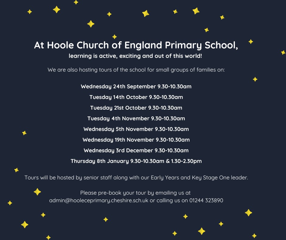 We are delighted to share the dates with you for Hoole CE Primary School’s open days and tours for children who will be starting Reception in September 2026.